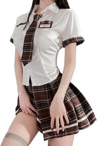 【セット内容】 トップス+ネクタイ+名札+スカート(4点セット)。【材質】ポリエステル繊維+ナイロン。【サイズ】適当サイズS-M 体重約40~55Kg適当。トップスもスカートもミニ丈、露出が多く、そのドキドキ感がたまらない~ バストぎりぎりに仕立てたショート丈トップス、裾にフリルがあしらわれたふんわりフリルスカートは、動きによってTバックが覗き見える…